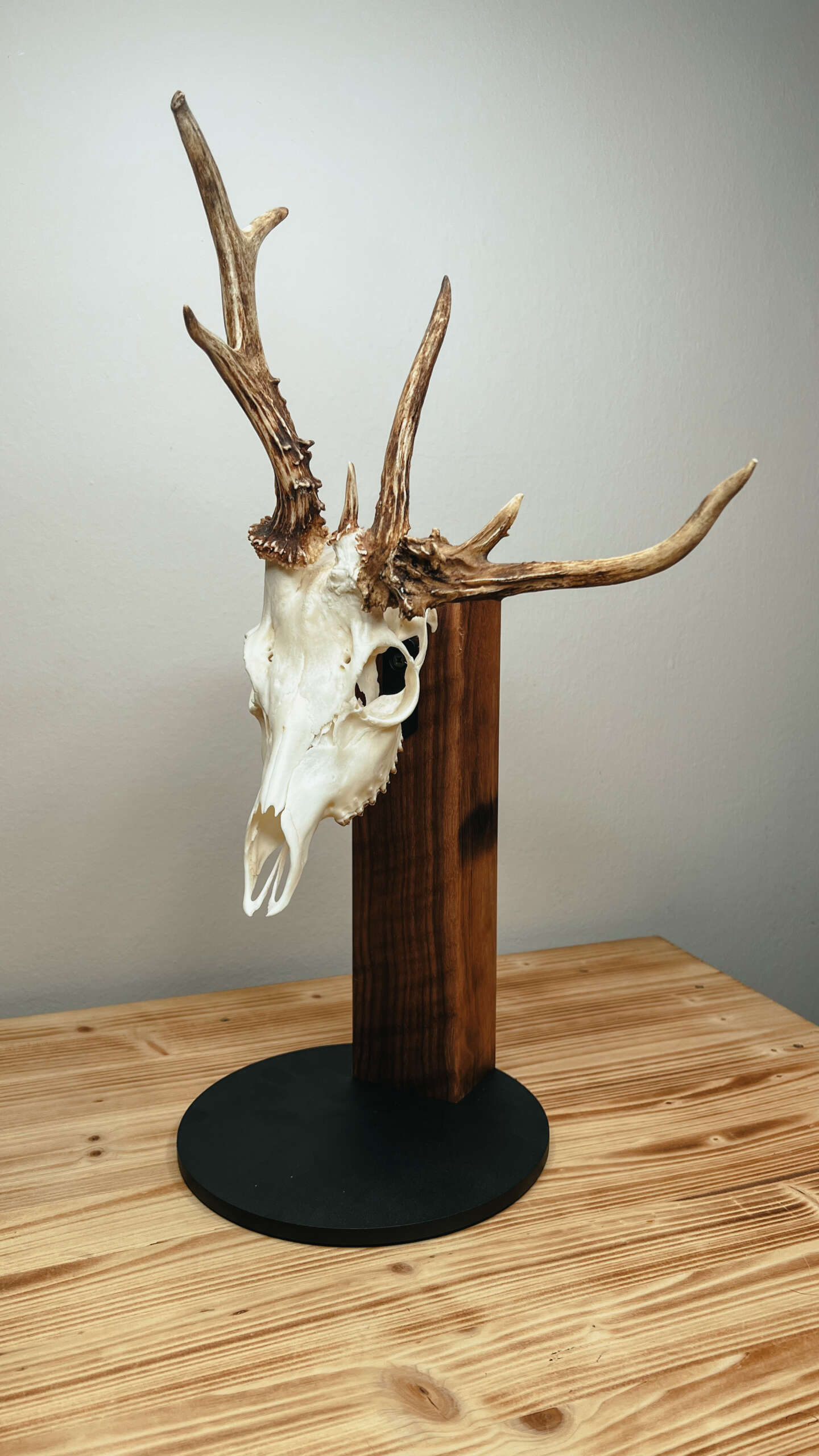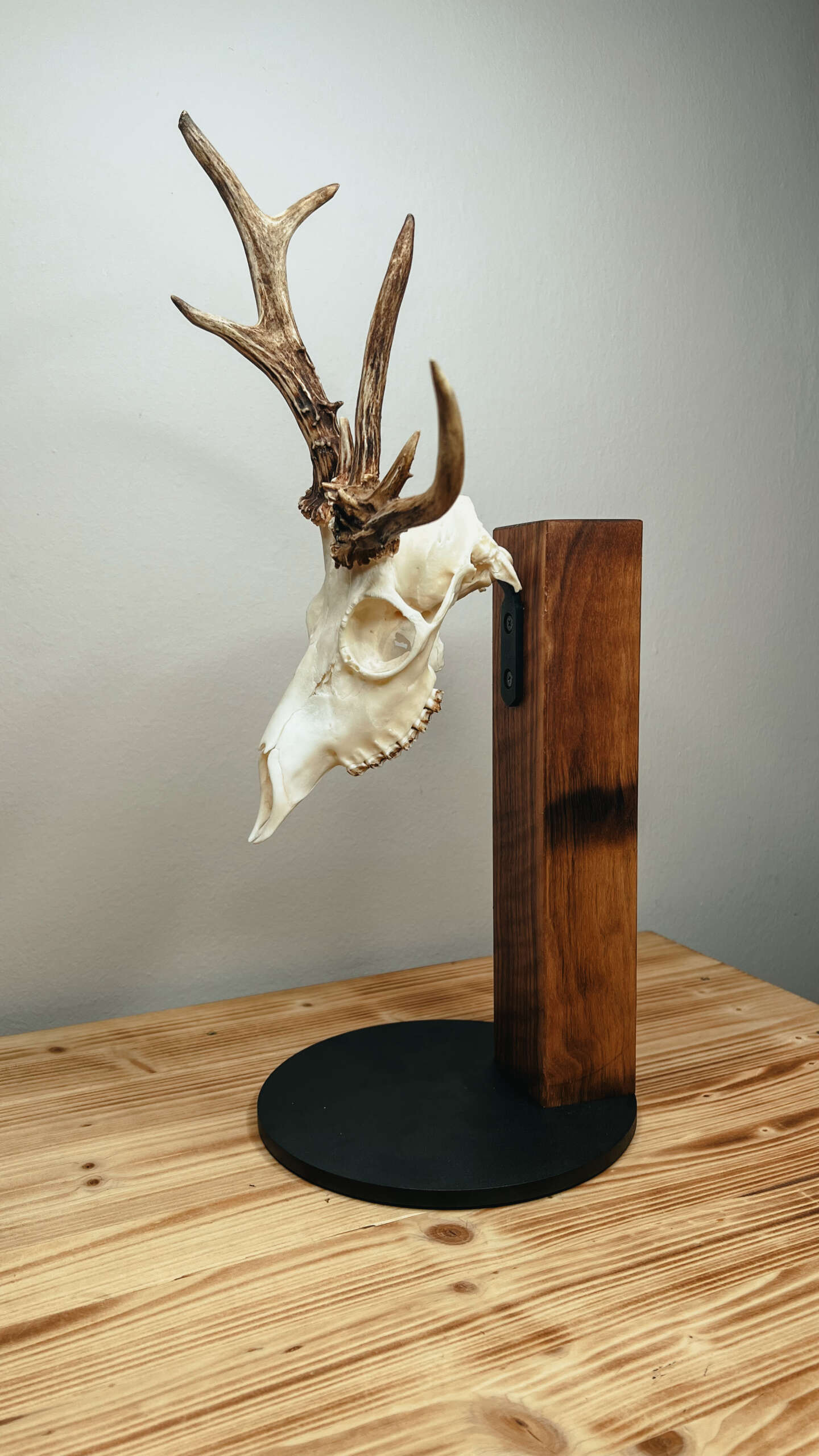 To elegantno stojalo je idealno za razstavljanje trofeje ene lobanje srnjadi ali gamsa. Kombinacija masivnega lesa in stabilnega kovinskega podnožja ne zagotavlja le privlačnega videza, temveč zagotavlja tudi visoko vzdržljivost in stabilnost.